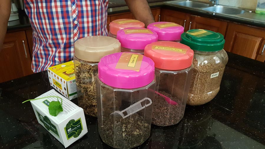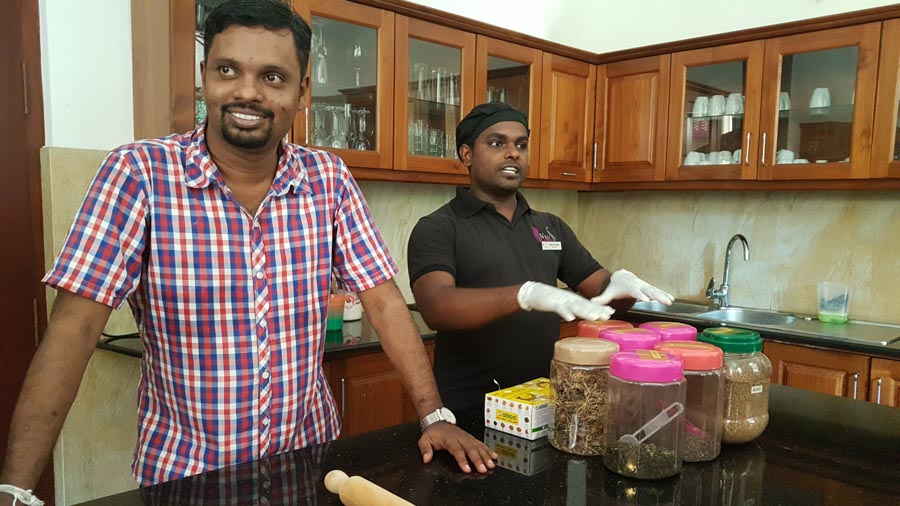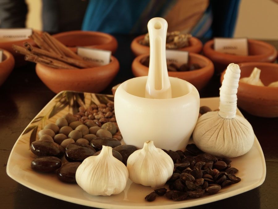 Der Arzt stellt die verschiedenen Tees, aus Kräutern, Wurzeln und Blüten vor. Er bezeichnet die Natur als ayurvedische Apotheke. Erstaunt ob der vielfältigen Wirkungsweisen die in den Tees stecken, fotografieren die Kurgäste eifrig die Teesorten welche bei ihren spezifischen Leiden eingesetzt werden.
