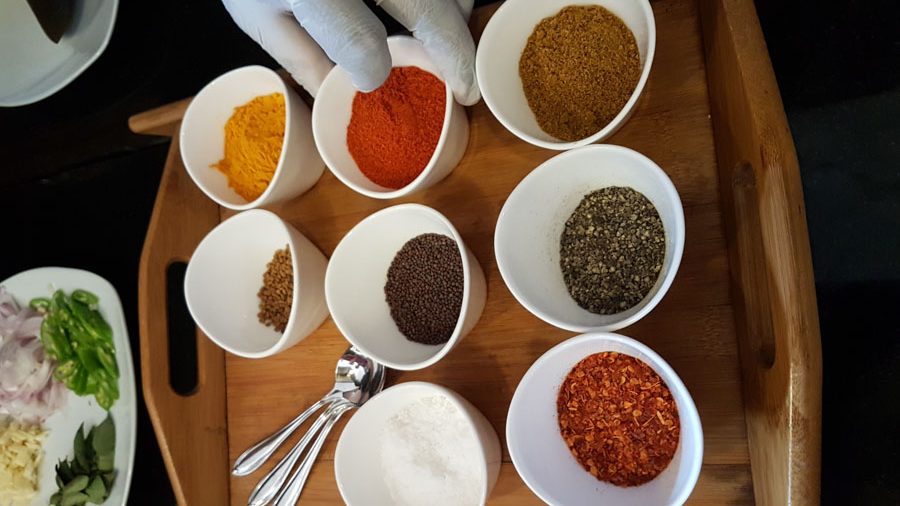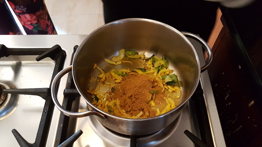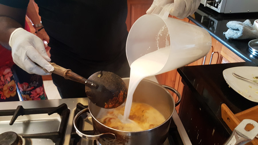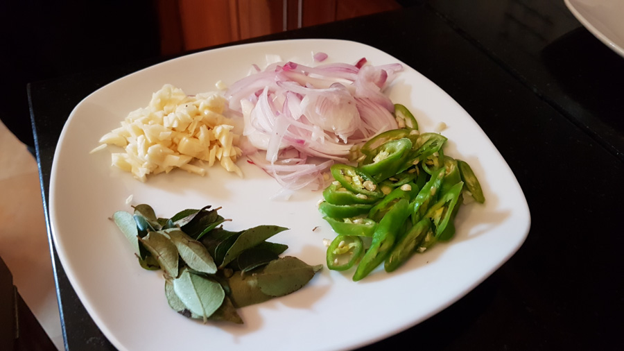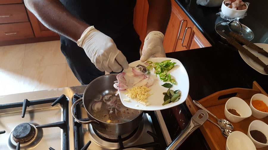 Für die Zubereitung des Fisch-Curries, erhitzt er das Kokosöl stark, gibt Senfsamen hinzu und lässt sie ihr Aroma entfalten. Erst dann kommen rote Zwiebeln, Knoblauch, Chillis und Curry-Blätter dazu, die gedünstet werden. Dann kommen Curry-Pulver und Salz dazu und schliesslich Wasser. Die Fischstücke werden reingelegt und vorsichtig gewendet, sodass sie nicht zerfallen. Am Schluss fügt er Kokosmilch hinzu und lässt das Curry gut kochen.