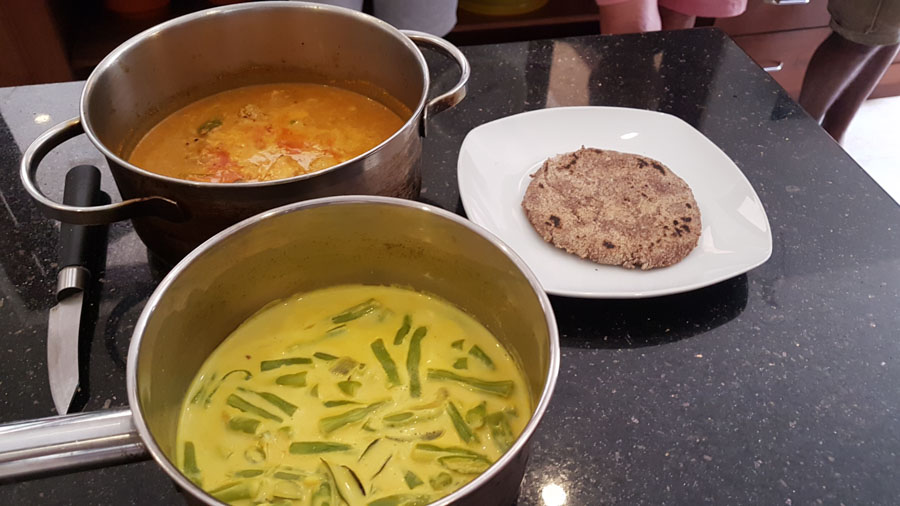 Der Chefkoch demonstriert die Zubereitung von Curries, auf zwei unterschiedliche Arten. Beide entsprechen den Richtlinien der ayurvedischen Küche. So gibt er die gerüsteten Bohnen ohne Oel in eine Pfanne, ergänzt die Zutaten und anschliessend das Kurkuma sowie die Kokosmilch.